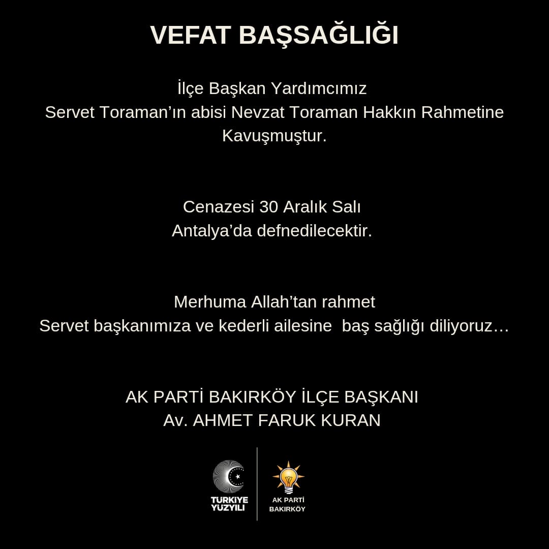 AK Parti Bakırköy İlçe Başkan Yardımcısı Servet Toraman’ın ağabeyi Nevzat Toraman hayatını kaybetti.Merhum Nevzat Toraman’ın cenazesinin 30 Aralık Salı günü Antalya’da defnedileceği bildirildi.AK Parti Bakırköy İlçe Başkanı Av. Ahmet Faruk Kuran, yayımladığı taziye mesajında, “Merhuma Allah’tan rahmet, İlçe Başkan Yardımcımız Servet Toraman’a ve kederli ailesine başsağlığı diliyoruz” ifadelerine yer verdi.HDR Grup Medya ailesi olarak merhuma Allah’tan rahmet, Servet Toraman’a ve kederli ailesine başsağlığı diliyoruz.