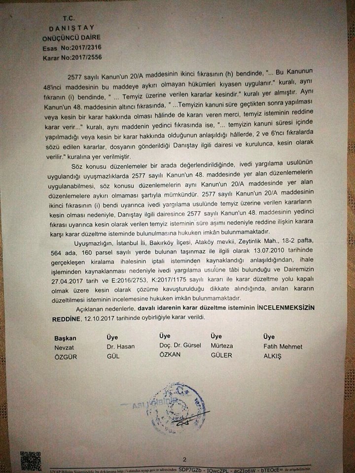 Ataköy sakini kemalettin doğan tarafından Danıştay 13.Dairesi 2017/2316 Esas-2017/2556 Karar ile 12.10.2017 Tarihinde Karar düzeltilmesi istemide reddedilerek karar kesinleşmiştir.