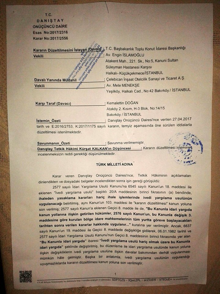 Mahkeme niçin kiralama yönteminin tercih edildiği, ihaleye kaç katılımcının katıldığı ve hangi teklife bırakıldığını TOKİ’den talep edip cevap alamayınca işlemi iptal etti. Kararı, TOKİ ve Çelebican Danıştay’da temyiz etti. Ancak 15 gün olan temyiz süresinden bir gün geç başvuru yapıldı. Müdahil şirketin temyiz başvurusu ise asıl davalının geç kalmasından dolayı kabul edilmemişti.