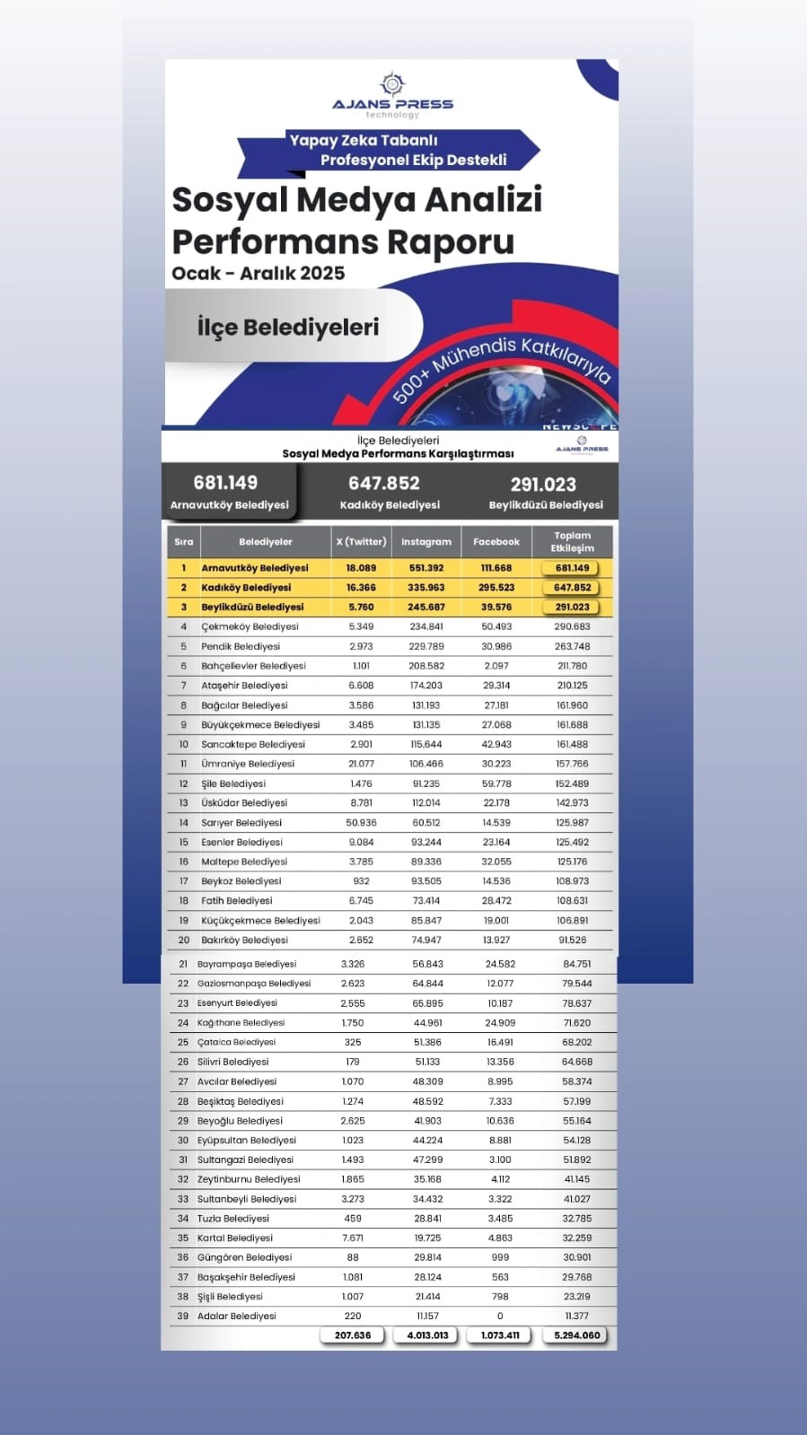 İstanbul’daki ilçe belediyelerinin sosyal medya performansları karşılaştırıldı. Açıklanan verilere göre, 2025 yılı sosyal medya etkileşim rakamlarında Arnavutköy Belediyesi ilk sırada yer aldı.X, Instagram ve Facebook platformları üzerinden elde edilen toplam etkileşimlerin değerlendirildiği karşılaştırmada Arnavutköy Belediyesi, 681 bin 149 etkileşimle listenin zirvesine yerleşti.Arnavutköy’ü Kadıköy Belediyesi 647 bin 852 etkileşimle ikinci sıradan takip ederken, Beylikdüzü Belediyesi 291 bin 23 etkileşimle üçüncü sırada yer aldı.Paylaşılan sonuçlara göre Arnavutköy Belediyesi, 2025 yılına ait sosyal medya etkileşim verileriyle öne çıkan ilçeler arasında yer aldı.Öte yandan, Bakırköy Belediyesi 20. sıradan girerek başarısız bir izlenim bırakmış durumda . Milyonlarca liralık Bütçesi olan Bakırköy Belediyesinin bu sıralaması akıllarda soru işareti bırakmış durumda ..Bakırköy Belediye Başkanı Ayşegül Ovalıoğlu'nun ekibi ne iş yapar ?