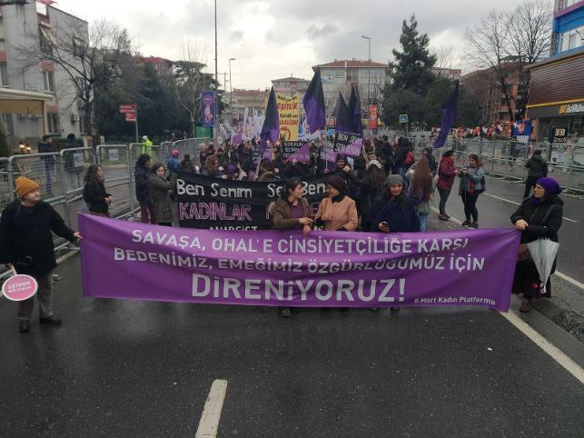 Yağmur ve soğuk havaya rağmen Dikilitaş Caddesi üzerinde bir araya gelen binlerce kadın Bakırköy Özgürlük Meydanı'na yürüdü. Yürüyüş kortejinde "Erkek iktidar savaş, biz barış istiyoruz", "Vardık, varız, varolacağız", "Güçlenerek değiştireceğiz, mücadelemizi büyüteceğiz, "Alanlardayız", "Emeğimiz, bedenimiz, kimliğimiz bizimdir", "Kadınlar evde değil sokakta güzel"," Kadınlar sükutta değil isyanda güzel", " Sokak seni çağırıyor", pankartları açılarak "Eşit işe ücret", "Kadın katliamına işçi kıyımına doğanın talanına AKP'nin yalanına son", "Tek bir kadının yaşamını bile tek bir adama bırakmayacağız", "Ücretli köleliği son", "Sınıfsal,ulusal, cinsel, sömürüye son", "Kadınlar savaş istemiyor", "En büyük şiddet savaştır, barış istiyoruz", "Barışı kadınlar örecek", "Nefrete inat yaşasın hayat", "Ev işçilerine insanca yaşacak ücret" dövizleri taşındı. Kortejde "Jin jiyan azadi", "Yaşasın kadın dayanışması", "Homofobik devlet yıkacağız elbet", " Erkek vuruyor devlet koruyor", " Dünya yerinde oynar kadınlar özgür olsa", " Susmuyoruz, korkmuyoruz itaat etmiyoruz" sloganları atıldı.