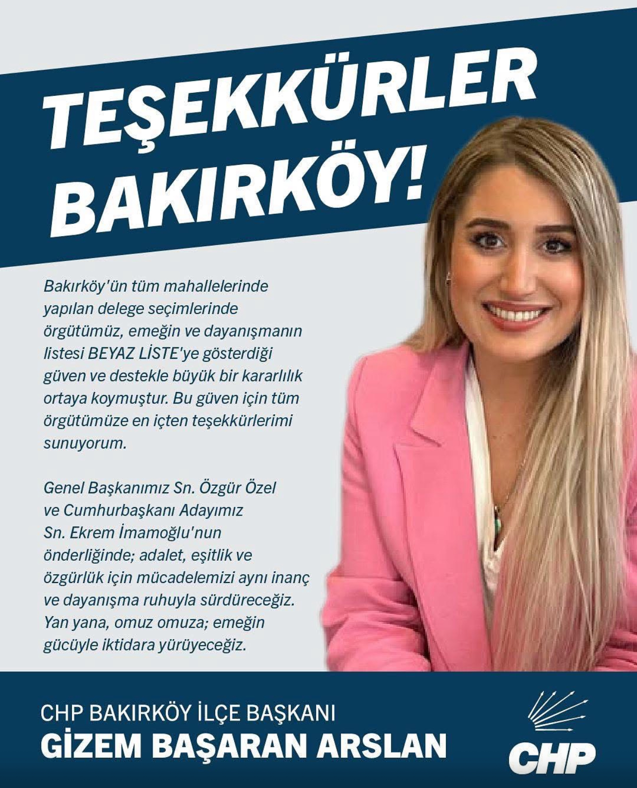 Bakırköy’ün tüm mahallelerinde gerçekleştirilen delege seçimlerinde, örgütün desteğini arkasına alan “Emeğin ve Dayanışmanın Listesi – Beyaz Liste” büyük bir başarı elde etti.CHP Bakırköy İlçe Başkanı Gizem Başaran Arslan, sonuçlarla ilgili olarak, “Örgütümüzün Beyaz Liste’ye gösterdiği güven ve destek, büyük bir kararlılığın göstergesidir. Bu güven için tüm örgütümüze en içten teşekkürlerimi sunuyorum” ifadelerini kullandı.Arslan, ayrıca, CHP Genel Başkanı Özgür Özel ve Cumhurbaşkanı Adayı Ekrem İmamoğlu’nun liderliğinde adalet, eşitlik ve özgürlük için mücadelenin aynı inanç ve dayanışma ruhuyla sürdürüleceğini vurguladı.“Yan yana, omuz omuza; emeğin gücüyle iktidara yürüyeceğiz” mesajı verildi.