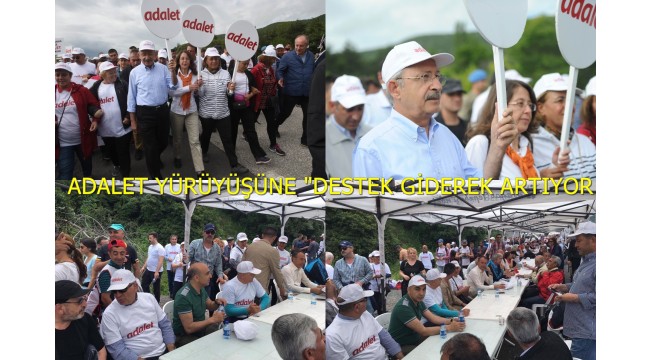 Perşembe günü Ankara Güvenpark'tan yola çıkan chp Genel Başkanı Kemal Kılıçdaroğlu öncülüğündeki adalet korteji, beşinci gününde de İstanbul'a doğru yürüyüşüne devam ediyor. ‘Adalet Yürüyüşü'ne Türkiye'nin ve dünyanın dört bir yanından destek gelirken, Kılıçdaroğlu'nun yürüyüş güzergahında karşılaştığı vatandaşlardan da olumlu tepkiler aldığı görüldü. 25 gün sürecek 432 kilometrelik yürüyüşün geçtiğimiz dört gününde yaklaşık 85 kilometre yol katedildi. Yoğun tempo ve artan sıcaklıklar nedeniyle günlük yürüyüş mesafesi 20 kilometreden 16 kilometreye düşürülürken, mola sürelerinin de uzatıldığı belirtildi. Adalet korteji dün yürüyüşünü sağanak yağmur altında sürdürmüştü.