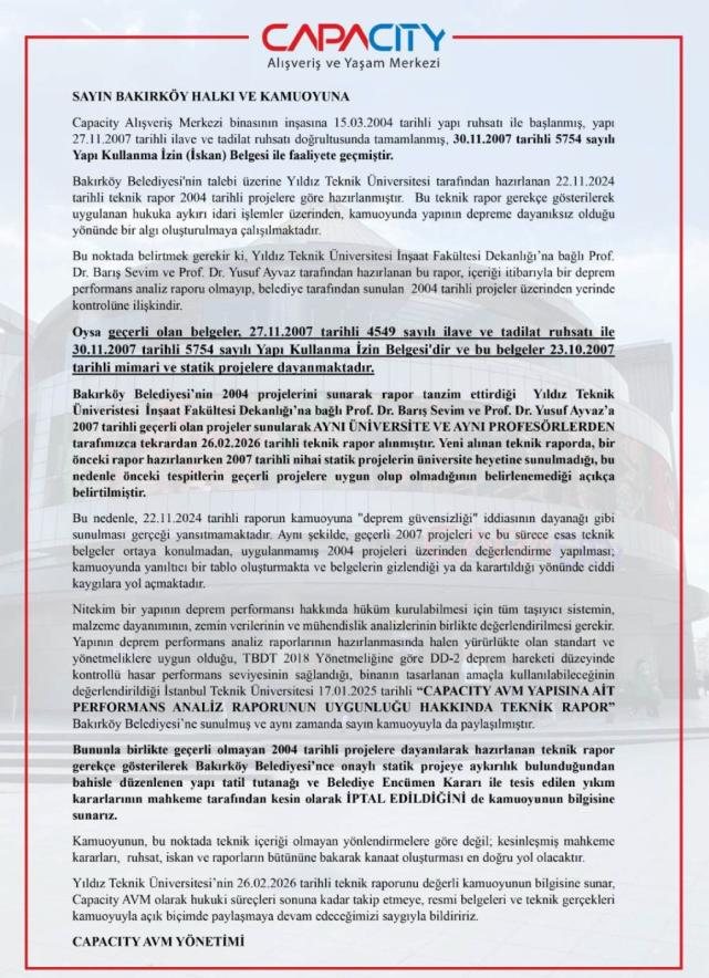 CAPACİTY AVM 'DEN BAKIRKÖY BELEDİYESİ'NE SERT AÇIKLAMA
