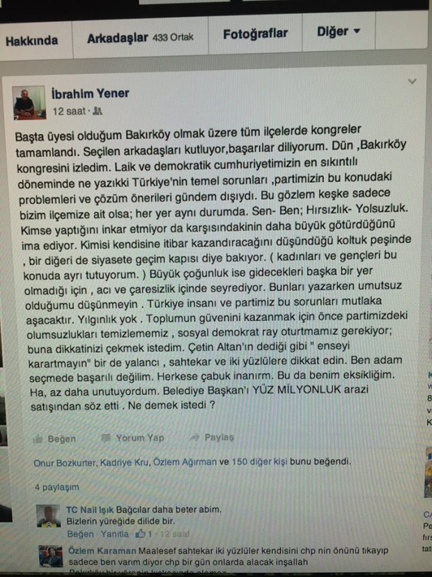 CHP Eski parti meclis üyesi İbrahim Yener sosyal medya Facebook üzerinden Bakırköy Belediye Başkanı Dr.Bülent Kerimoğluna sordu.