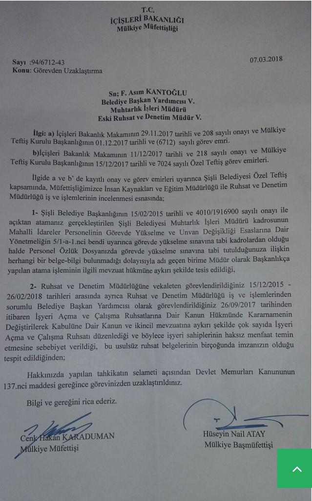 Mülkiye Başmüfettişi Hüseyin Nail Atay'ın başkanlığında yürütülen çalışmalarda, İmardan sorumlu Teknik Başkan Yardımcısı Nimet Toprak ile Zabıta ve Ruhsat'tan Sorumlu Başkan Yardımcısı Asım Kantoğlu, soruşturmanın selameti açısından geçici olarak görevlerinden uzaklaştırıldı.Müfettişlerin yürüttüğü soruşturma kapsamında CHP'li meclis üyesi Selahattin Engez'in restaurantına verilen ruhsatın yanı sıra Gümüş Otel, Kılıç Plaza'nın da aralarında bulunduğu bazı binalarda kaçak ve imara aykırı işlemler yapıldığı tespit edildi. Belediyedeki özellikle ruhsatların ve imar dosyalarının tek tek incelendiği soruşturmanın derinleştirileceği öğrenildi.