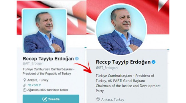 16 Nisan referandumundan sonra AKP’ye geri dönem cumhurbaşkanı Recep Tayyip Erdoğan, twitter hesabında çok önemli bir değişikliğe imza attı. Erdoğan, “Türkiye Cumhuriyeti Cumhurbaşkanı” ifadesi yerine “Türkiye Cumhurbaşkanı” yazdı.Erdoğan’ın resmi twitter hesabında daha önce “Türkiye Cumhuriyeti Cumhurbaşkanı” ifadesini kullanıyordu.İşte o değişim: