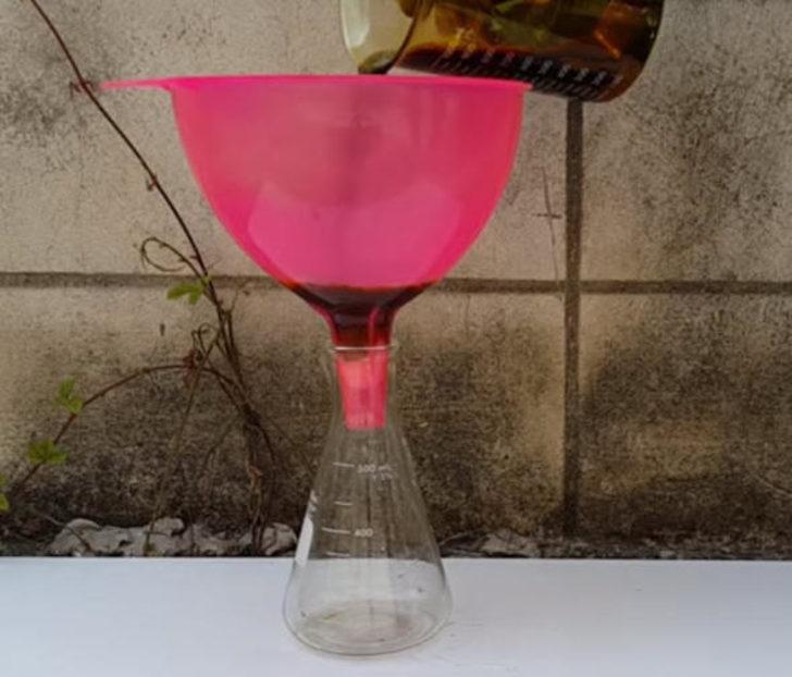 Şimdi de huni aracılığıyla yeni bir kaba boşaltıyoruz.