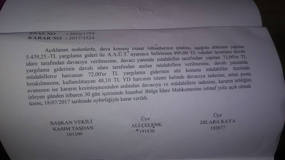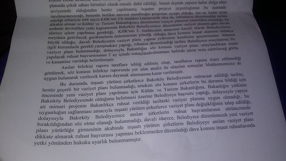 Bakırköy Belediyesi ruhsat iptali için mahkemeye "Yapı ruhsatı verme yetkisi belediyemizde olması gerekirken 564 ada 142 parsel yanı diye parseli belli olmayan bir yere iksa, ofis ve işyeri olarak iki ay içinde yetkili idarelerce ruhsatlandırma yapılmaması bahane edilerek yapı ruhsatının tanzim edilmesi hukuka uygun değildir" itirazında bulunarak dava açmıştı.