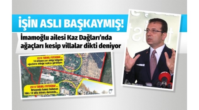 11 bin 925 metrekarelik alanda ağaçların katledildiği iddiasına yer verdi.Haberde “Kaz Dağları Milli Parkı’nın hemen yanında İmamoğlu ailesine ait 11 bin 925 metrekarelik arsada yüzlerce ağacın kesildiği açıkça görülüyor.CHP’li İmamoğlu araziye üç yıl içinde 10 adet havuzlu lüks villa yaparken, bölgedeki CHP’li belediyeler ise buna ‘Dur’ demek yerine yol verdi. CHP’li İstanbul Büyükşehir Belediye(İBB) Başkanı Ekrem İmamoğlu ve babası Hasan İmamoğlu’nun Kaz Dağları’nda aldığı arsalarda ağaçları keserek yeşil alanları nasıl betona çevirdikleri gözler önüne serildi. Kaz Dağları’nda Hasan İmamoğlu’nun 6 bin 914 metrekare, Ekrem İmamoğlu’nun 5 bin 11 metrekare arsası ve dairesi bulunuyor.” ifadelerine yer verildi.İMAMOĞLU YALANLADIEkrem İmamoğlu cephesi ise haberin yalan olduğunu savundu. İmamoğlu cephesinden yapılan yazılı açıklamada “22 Ağustos 2019 günlü SABAH gazetesinin manşetinde İBB Başkanı Sayın Ekrem İmamoğlu ile ilgili haber yayınlanmıştır. Haberin gerçeklerle alakası yoktur. Söz konusu yapılar Güre köyü içinde ve 1990 yılında imara açılmış bölgededir. Arsa Sayın İmamoğlu'nun basası Hasan İmamoğlu tarafından bir ortağı ile 2008 yılında satın alnmış, sonrasında kat karşılığı bina yaptırılmıştır.Söz konusu 90'ar metrekarelik 5 daire Sayın Hasan İmamoğlu'nun malvarlığı listesinde de yer almaktadır. Güre Köyü'nün Kaz Dağları'nda ne kadar uzakta olduğu da herkesin malumudur. Bilgi kirliliği yaratmak isteyenlerin niyetleri ortadan kaldırmak amacıyla bu açıklamayı yapmak zorunlu görülmüştür.” ifadelerine yer verildi.