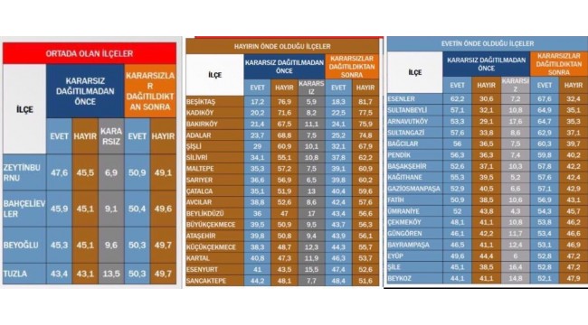 Uluslararası saygın bir anket firması 10/15 Mart tarihleri arasında 3500 kişi ile istanbul"un ilçelerinde yüzyüze yapmış olduğu ankette 17 ilçe de "hayır"17 ilçe de "evet" oylarının şu an için önde olduğu 4 ilçede ise başabaş bir mücadelenin sürdüğü görülüyor.Hayırcıların ve Evetçilerin referandum tarihi 16 Nisana 10 gün kala propagandalarını kendilerinin oylarının az olduğu ilçelere yoğunlaştıracakları görülüyor.