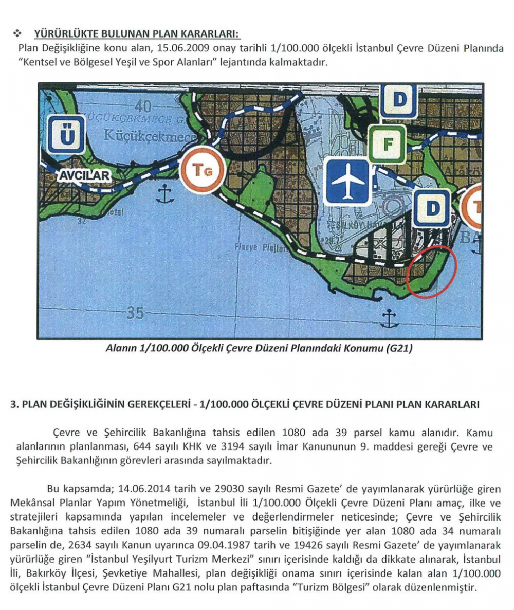 KERİMOĞLU: PLAN DEĞİŞİKLİĞİYLE İMARA AÇILDI26 Aralık 2017 tarihinde Çevre ve Şehircilik Bakanlığı’nda bir plan değişikliğinin yapıldığını söyleyen Bakırköy Belediye Başkanı Bülent Kerimoğlu da “Burası Yaklaşık 70 yıldır geçmişte bir kooperatifler birliği olarak kurulmuş olan Yeşilyurt’ta özel mülkiyet alanında bir plan değişikliği yapılarak çocuk oyun parkları, yeşil alanlar ve deniz dolgu alanında bir imar açılması söz konusu. Burada yaklaşık 30 bin metrekarelik alanda bir imar değişikliği yapılarak ne yazık ki, yeşilyurt halkının oyun parklarını, yeşil alanlarını ve denize ulaştığı alan olarak kullandığı yerlerde bir plan değişikliği yapılarak imara açıldı” dedi.Kerimoğlu, “Bir karar alınması için mahkemeye başvuru yaptık. Biz hukukun kamu yararını gözeterek halkın buradaki taleplerini gözeterek, halkın buradaki taleplerini göz önünde bulundurarak ayrıca bölgenin bir deprem bölgesi olmasını da göz önünde bulundurarak bu Çevre Bakanlığı’nın yapmış olduğu planları iptal edeceğini ümit ediyoruz.Bakırköy 1 Derece Deprem bölgesi burda Kentsel dönüşüm için 1 kat imar izni verilmezken ,nasıl oluyorda sahile 15 kat özel imar izni veriliyor ?diye konuştu.