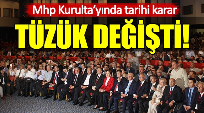 MHP'nin tarihi kurultayı değişim isteyenlerin zaferiyle sonuçlandı. 13 maddenin değiştirildiği tüzük kurultayında çok önemli bir karar daha alındı. Kurultayda, 10 Temmuz'da seçimli kongre kararı alındı. Ancak 10 Temmuz'daki kongreyi MHP Genel Merkezi değil, kurultay tarafından yetkili kılınan 3 kişilik heyet toplayacak.Delegelerin oy birliğiyle yetkilendirdiği kongre heyeti şu isimlerden oluşuyor:Müsavat DervişoğluŞefik ÇirkinFatih Demirkol GENEL MERKEZ KONGREYİ TOPLAYAMAZSiyasi partiler kanununa göre bir siyasi partinin en yüksek yetkili organı Büyük Kongresi'dir. Dolayısıyla, bugün alınan 10 Temmuz 2016'da genel başkan seçimli kongre kararı ve belirlenen seçim kurulu geçerlidir.Genel Merkez'in 10 Temmuz'da yapacağı kurultayın kanunen hiçbir geçerliliği bulunmamaktadır.10 Temmuz'da genel başkanlık seçiminin yapılacağı kurultayı Büyük Kongre'de yetkili kılınan 3 kişilik heyet toplayacak.