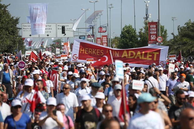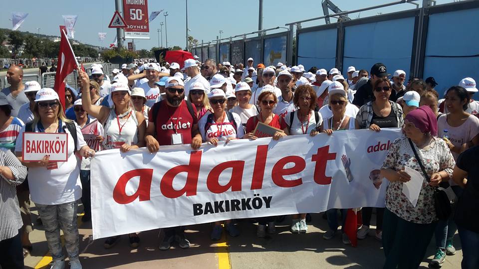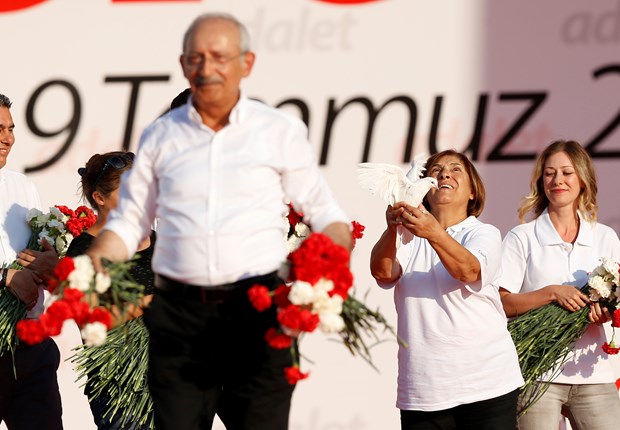 “GEÇMİŞTE SIKIYÖNETİM DÖNEMLERİNDE PAŞALAR, HİTLER ALMANYA’DA YAPIYORDU”Kılıçdaroğlu, “Üniversiteden atılan hocalar için yürüdük. KHK ile üniversite hocalarının kapının önüne konulması tam bir demokrasi ayıbıdır. Geçmişte bunu 1402’likleri hatırlarsınız sıkıyönetim dönemlerinde paşalar yapıyordu. Hitler Almanya’da yapıyordu. Şimdi Kaboğlu gibi dünya çapında bilinen önemli isimler kapının önüne konuldu ve yurt dışına çıkışları da yasaklandı. Yasaklayanları kınıyorum” diye konuştu.“FETÖ’YE KARŞI OLDUĞUMUZ İÇİN YÜRÜDÜK”Kılıçdaroğlu, “Kamu görevlerinden atılanlar için, çocuk işçiler için, orman köylüleri için, hapisteki askeri öğrenciler, hapisteki er ve erbaşlar için yürüdük. Linç edilen askerler için yürüdük. Tek adam rejimine karşı çıktığımız için yürüdük, FETÖ’ye karşı olduğumuz için, yürüdük. 20 Temmuz darbesine karşı, olduğumuz için yürüdük” dedi.“IŞİD, PKK, EL -NUSRA VE DİĞER TERÖR ÖRGÜTLERİNE KARŞI OLDUĞUMUZ İÇİN YÜRÜDÜK”Kılıçdaroğlu, “IŞİD, PKK, El -Nusra ve diğer terör örgütlerine karşı olduğumuz için, gazi Meclis’e sahip çıktığımız için yürüdük. Yargı siyasetin emrine verildiği için yürüdük. Devlette liyakat sistemi olmadığı için yürüdük” dedi.“MAVİ MARMARA ŞEHİT VE GAZİLERİ İÇİN YÜRÜDÜK”Kılıçdaroğlu, “Şiddet mağduru kadınlarımız için yürüdük, onursuz bir anlaşmayla Mavi Marmara şehitlerinin hakları ellerinden alındığı için yürüdük” dedi.“NURİYE VE SEMİH İÇİN YÜRÜDÜK”Kılıçdaroğlu, “KHK ile görevlerinden atılan, işine geri dönmek için hak arayan, hak aradığı için terörist ilan edilip hapise konulan açlık grevindeki kardeşlerimiz, Nuriye ve Semih için yürüdük. Can ve mal güvenliği olmadığı için korku iklimi nedeniyle konuşamayan iş dünyası için yürüdük” dedi.