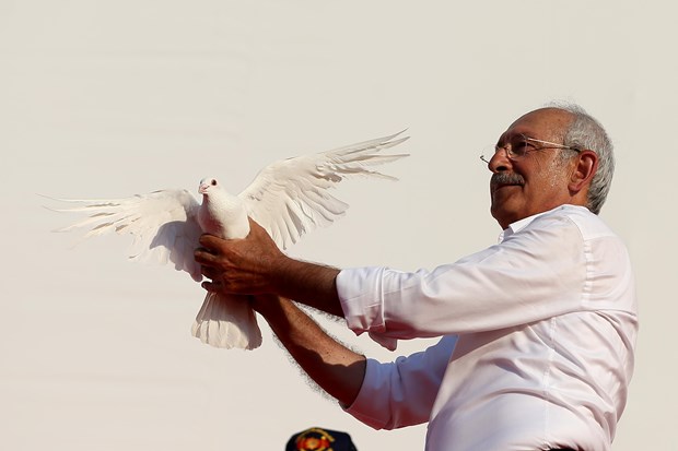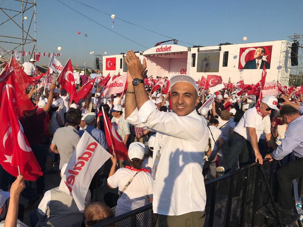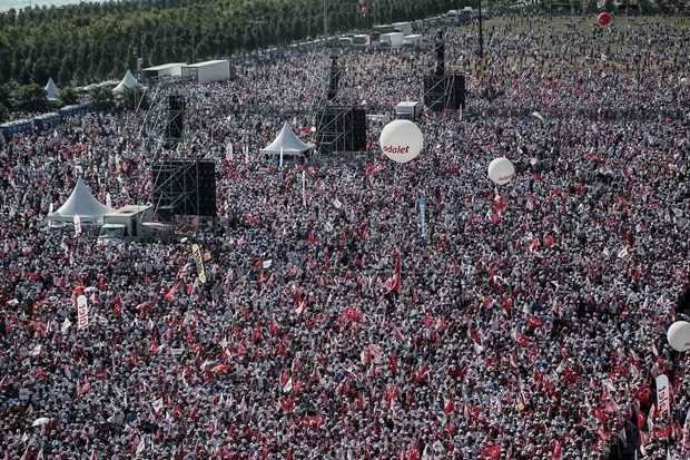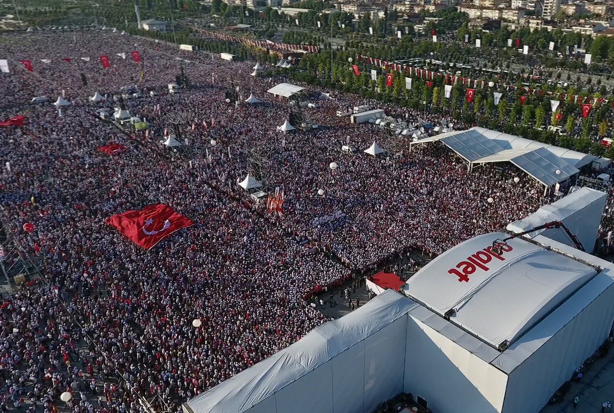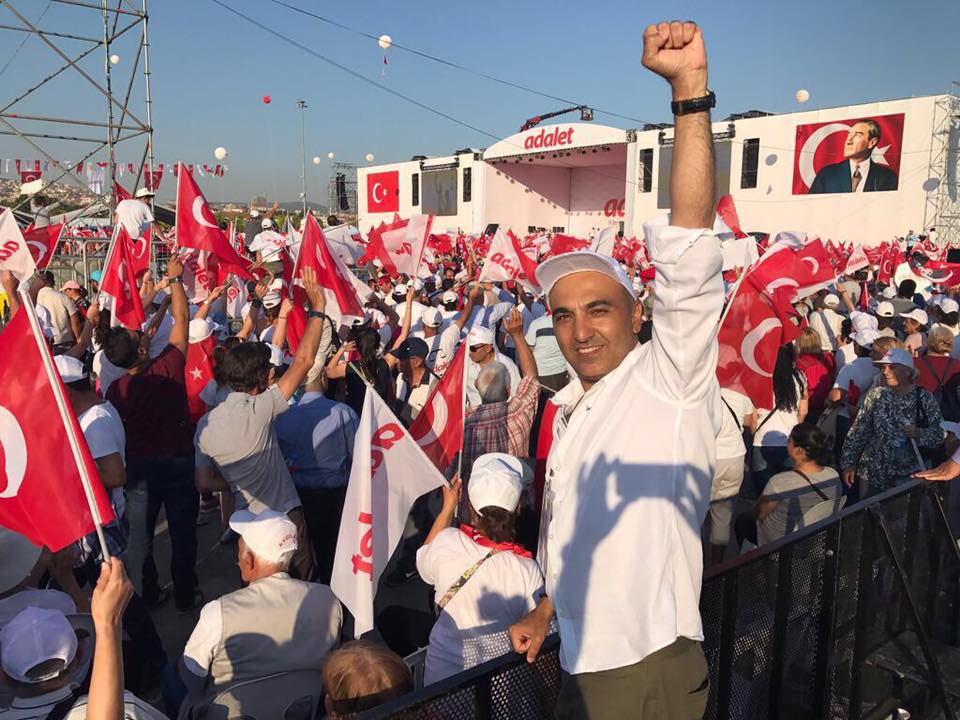 “HARP OKULU’NDAYKEN TUTUKLANAN OĞLU İÇİN YÜRÜYEN VEYSEL AMCA’YA SELAMLARIMI, GÖNDERİYORUM”Kılıçdaroğlu, “Yol boyunca büyük bir kısmını birlikte yürüdüğümüz Harp Okulu’ndayken tutuklanan oğlu için yürüyen Veysel Amca’ya da selamlarımı, saygılarımı gönderiyorum. Ve tabii ki yolda gelirken bizi protesto eden sevgili vatandaşlarımız da vardır. Hiç kimse unutmasın, Kemal Kılıçdaroğlu herkese saygılıdır. Onlara da şükranlarımı, saygılarımı gönderiyorum. Bu ülkeye birinci sınıf demokrasiyi mutlaka getireceğiz. Herkes özgürce düşüncesini ifade edebilecek. Bir teşekkürüm de güvenlik güçlerimize. Ankara’dan İstanbul’a kadar polisinden jandarmasına bütün güvenlik güçleri bizim burada sağlıklı olarak toplanmamız için olağanüstü çaba harcadılar. Halkın polisine, jandarmasına buradan selamlarımı, saygılarımı gönderiyor teşekkür ediyorum” açıklamasında bulundu.“BİZ YÜRÜRKEN TAŞKINLIK YAPACAĞIMIZI DÜŞÜNÜYORLARDI. VURUP KIRACAĞIMIZI DÜŞÜNÜYORLARDI”“Dünyanın en barışçıl, yürüyüşünü, eylemini yaptık” diyen Kılıçdaroğlu, “Hiçkimse unutmasın biz yürürken taşkınlık yapacağımızı düşünüyorlardı. Vurup kıracağımızı düşünüyorlardı. Dünyanın en barışçıl, yürüyüşünü, eylemini yaptık. Hiçbir yurttaşımızın burnu dahi kanamadı. Adalete susayan bütün 80 milyona şükranlarımı sunuyorum” ifadelerini kullandı.“HASAN TATLI’NIN KIZLARI BABALARININ VASİYETİNİ YERİNE GETİRDİLER”Kılıçdaroğlu, “Bir acı kaybımız oldu. Hasan Tatlı yürüyüşün başında geçirdiği kalp krizi sonucu hayatını kaybetti. Ona Allah’tan rahmet diliyoruz. Ailesine yakınlarına başsağlığı diliyoruz. İki kızı yürüyüş sırasında geldiler ve bir etaba katılarak babalarının vasiyetini yerine getirdiler” dedi.