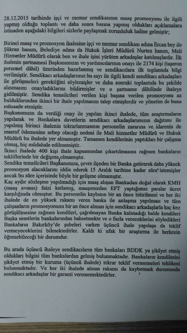 Bakırköy belediyesinde sular durulmuyor.Belediye iş bşk ve bşk yrd.baskıyla temsilcilerine mesai yazdırmaya başladığı iddiaları herkesi rahatsız etti. Sendika Promosyon konusunda 2 defa ihale yapılmasına rağmen hatalarından dolayı ihale düşük kalmış sebep olarak belediyeyi suçlu göstermiş BDDKya şikayette bulunmuşlardır