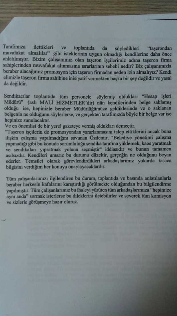 İddia edilen odur ki,Cuma günü promosyon için toplanan Bakırköy Belediye İş Sendikası Başkanı ve Yardımcısı adeta belediye işçilerin sorununu bırakıp illagal örgütlerin taşeronluğunu yapmış , bu durum park bahçe , fen işleri ve atölye müdürlüğü işçilerinde olağan üstü rahatsızlık yaratmış kendi içinde istifalar meydana geldiği iddiaları işçiler arasında da huzursuzluk yaratmıştır..