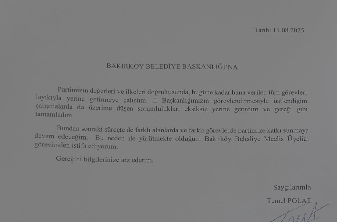 Temel Polat yaptığı açıklamada;"Yürütmekte olduğum Bakırköy Belediye Meclis Üyeliği görevimden istifa ediyorum.Bugüne kadar, partimizin değerleri ve ilkeleri doğrultusunda bana verilen tüm görevleri layıkıyla yerine getirmeye gayret ettim. İl Başkanlığımızın görevlendirmesiyle yürüttüğüm çalışmalarda da sorumluluklarımı eksiksiz yerine getirmenin gururunu yaşıyorum.Şimdi, Bahçelievler'de daha fazla sorumluluk almak ve partimize yeni bir enerji katmak için, her türlü fedakârlığı göze alarak daha çok çalışacağım yeni bir yola çıkıyorum.İl Başkanımız Özgür Çelik'in liderliğinde, Rıza Başkanımızın yoldaşlığında, Ekrem Başkanımızın vizyonunda ve Genel Başkanımız Özgür Özel'in önderliğinde; bu ülkeye hak, hukuk ve adaleti getirme mücadelemizi büyüteceğiz.Cesaretimizi cesaretinizden alacağız, cesaretimizi yenemeyecekler.Gerçeklere olan inancımıza yenilecekler.Tüm tutuklu belediye başkanlarımızı ve yol arkadaşlarımızı özgürlüklerine kavuşturacağız.Birlik olacağız, beraber olacağız, güçlü olacağız!"